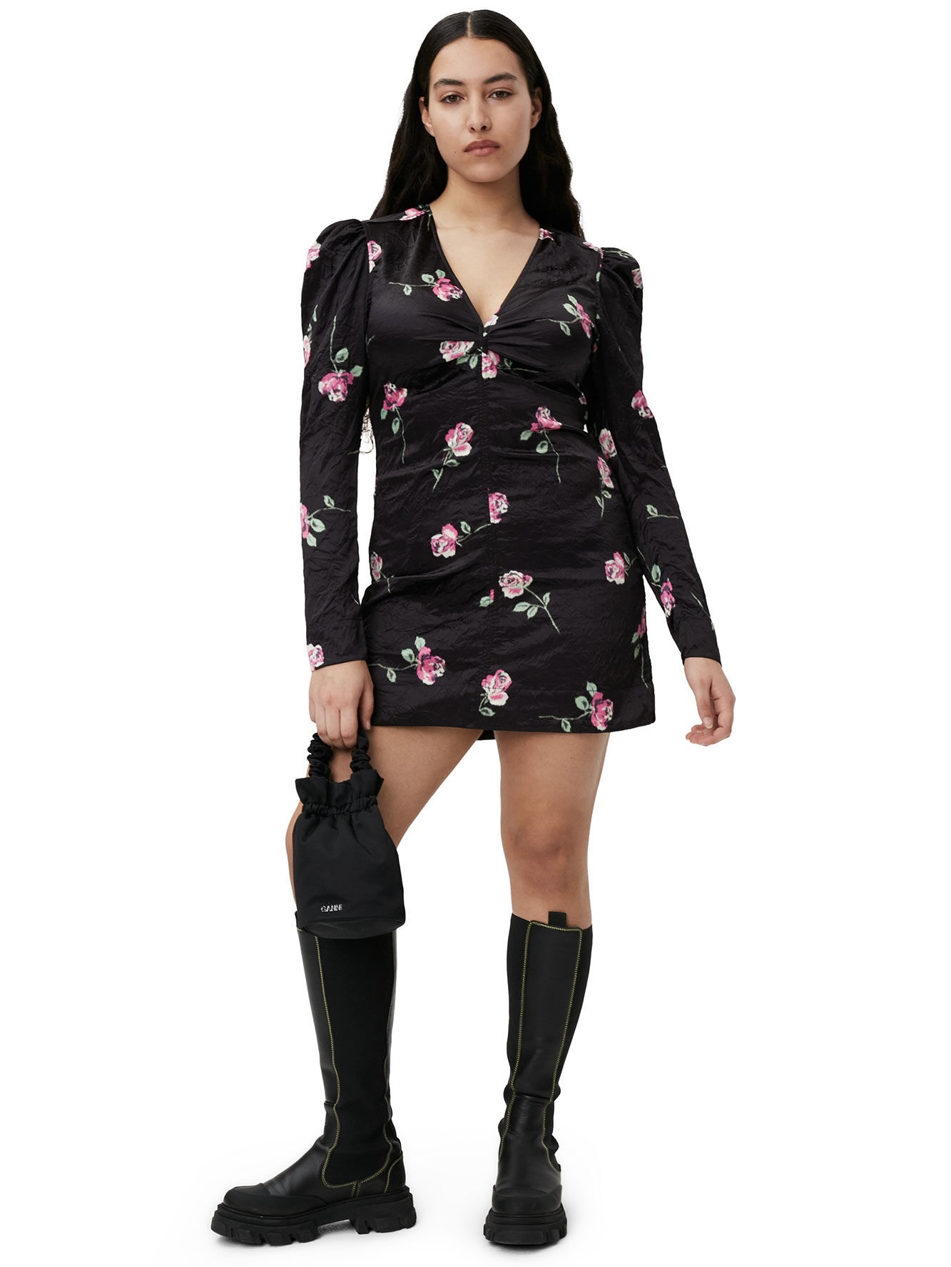 Crinkled Satin V-neck Mini Dress er laget av certified recycled polyester. Kjolen er designet for en slimfit-passform og har en V-hals, lange puffermer, glidelåslukking, blomstertrykk og en krøllet satenglook.