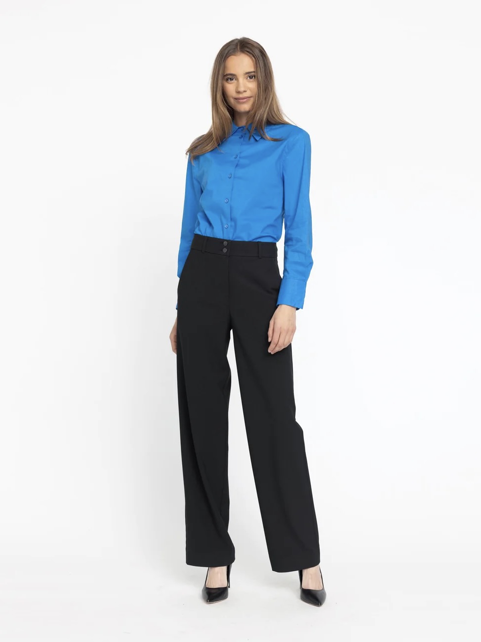 Sophia 285 Black, som strekker seg komfortabelt, er formelle bukser som lar deg føle deg fri til å være deg selv til tross for deres definitive uttrykk. De har høy midje, fremhever midje og hofter, og har en vanlig benlengde. Laget i tett ensvevet stoff med klassisk design og vakre, flytende ben som roter seg trygt rett ned i bakken, og materialiserer seg som ydmyke, uttrykksfulle og robuste.