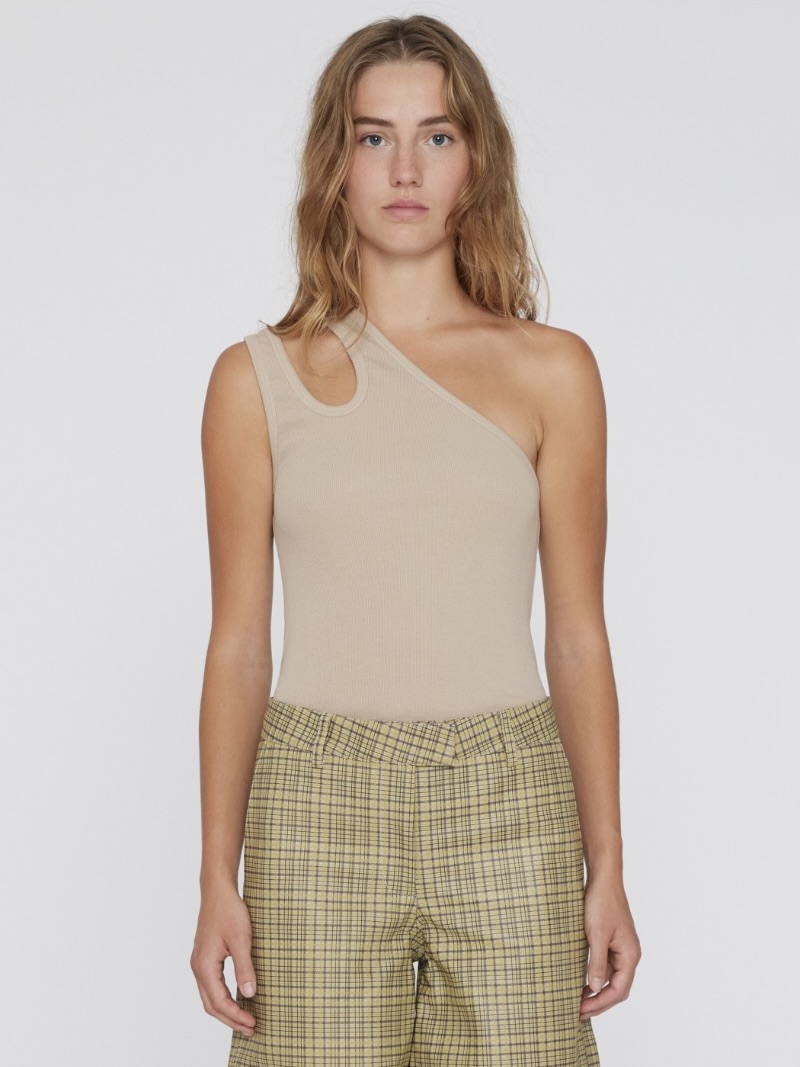 Remain Rib Jersey Cut-Out Top er en asymmetrisk singlett med utskjæringsdetalj på den ene skulderen og en ettersittende passform. Singletten kommer i ribbet bomull og med dobbel skulderstropp.