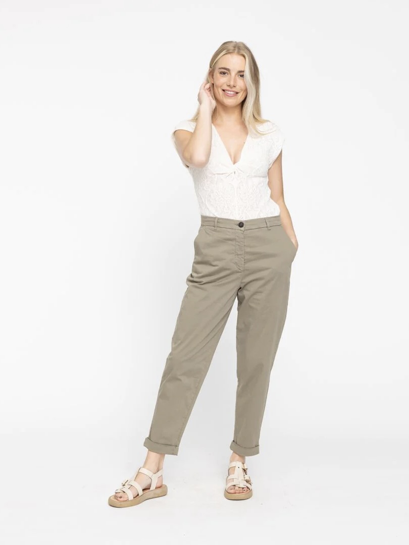 Emma 057 Green Tea strekker seg komfortabelt og er avsmalnende, uformelle, herreklær-inspirerte bukser – chinos – som lar deg føle deg fri til å være deg selv. De er midt i midjen, hviler på hoftebenet som fremhever hoftene og lårene, ender ved anklene, og kan plasseres midt i midjen, som tiltenkt, eller høyere på midjen for et annet utseende og følelse. Laget i tett satengstoff med et uformelt utseende og utformet med oppbrettede falder.