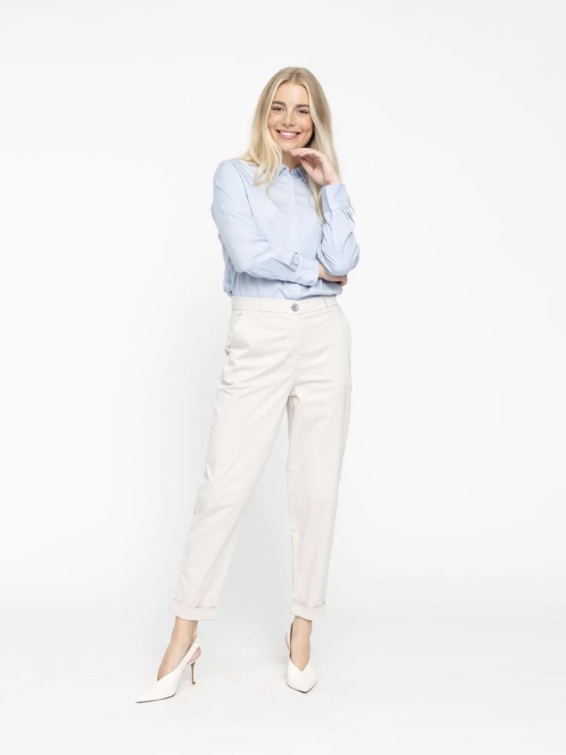 Emma 057 Moonbeam strekker seg komfortabelt og er avsmalnende, uformelle, herreklær-inspirerte bukser – chinos – som lar deg føle deg fri til å være deg selv. De er midt i midjen, hviler på hoftebenet som fremhever hoftene og lårene, ender ved anklene, og kan plasseres midt i midjen, som tiltenkt, eller høyere på midjen for et annet utseende og følelse. Laget i tett satengstoff med et uformelt utseende og utformet med oppbrettede falder.