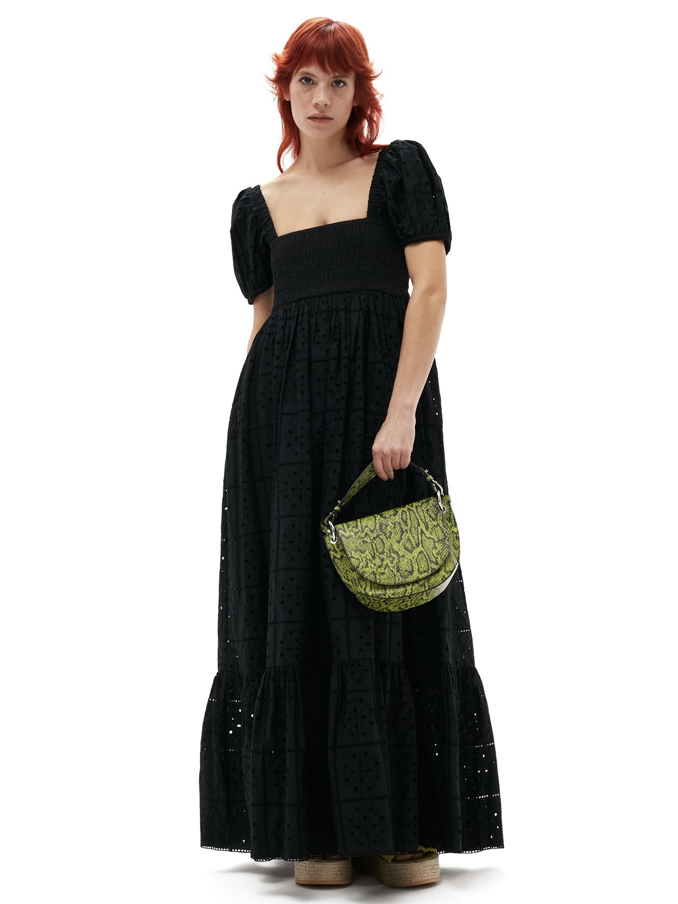 Broderie Anglaise Maxikjole i 100 % økologisk bomull. Kjolen er designet i normal passform med firkantet utringning, åpen rygg, smock-bodice og puffermer med elastiske kanter.