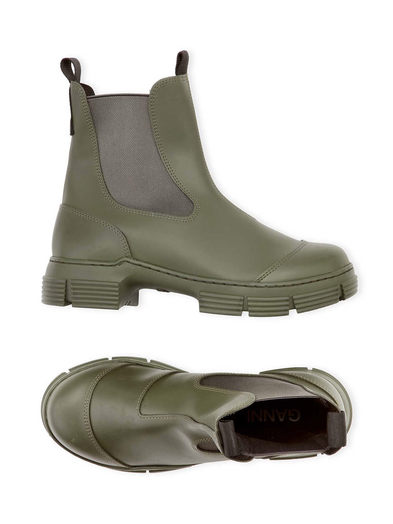 Dette er våre karakteristiske bystøvler i resirkulert gummiblanding, med elastiske paneler i chelsea-stil, tåhette-detaljer, trekkfliker og tykke såler. Skoene er vannavstøtende og har en hælhøyde på 4 cm.