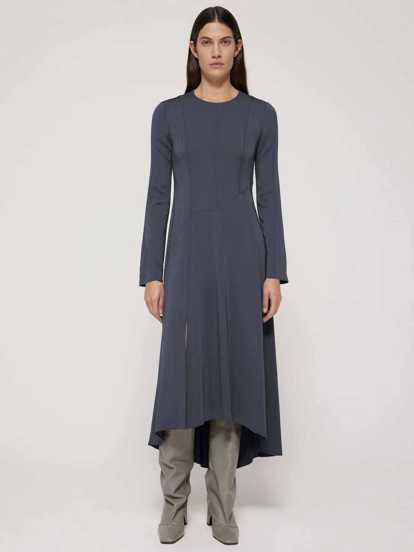 Kjole med flytende sømmer med fine sømmer og sidesplitt.