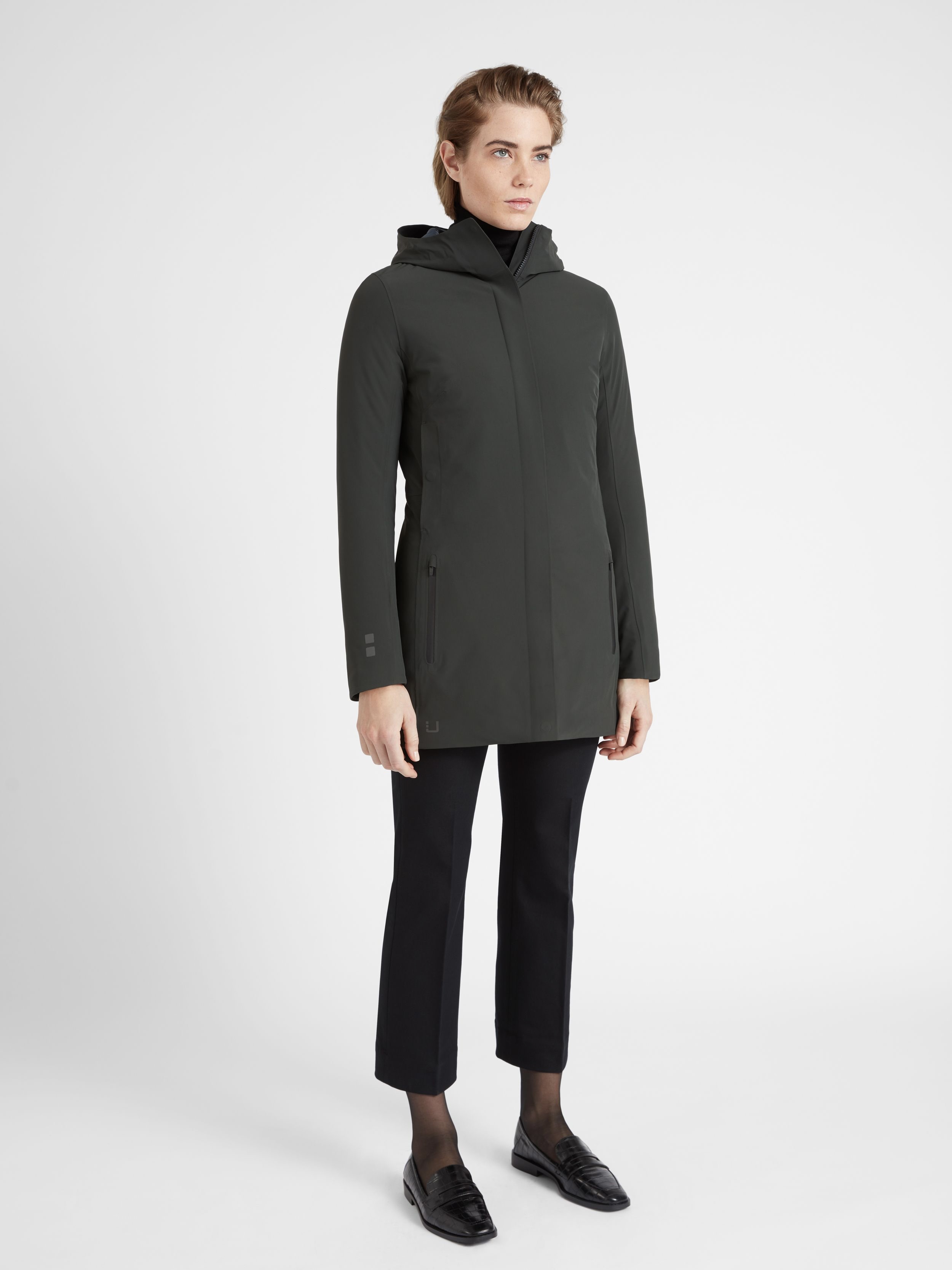 Høyteknisk vinterparkas med en følelse av luksus. Ultra varm, men vakker slank form. 3/4 lengde. Vanlig passform. Den har en vannsøyle på 20 000.