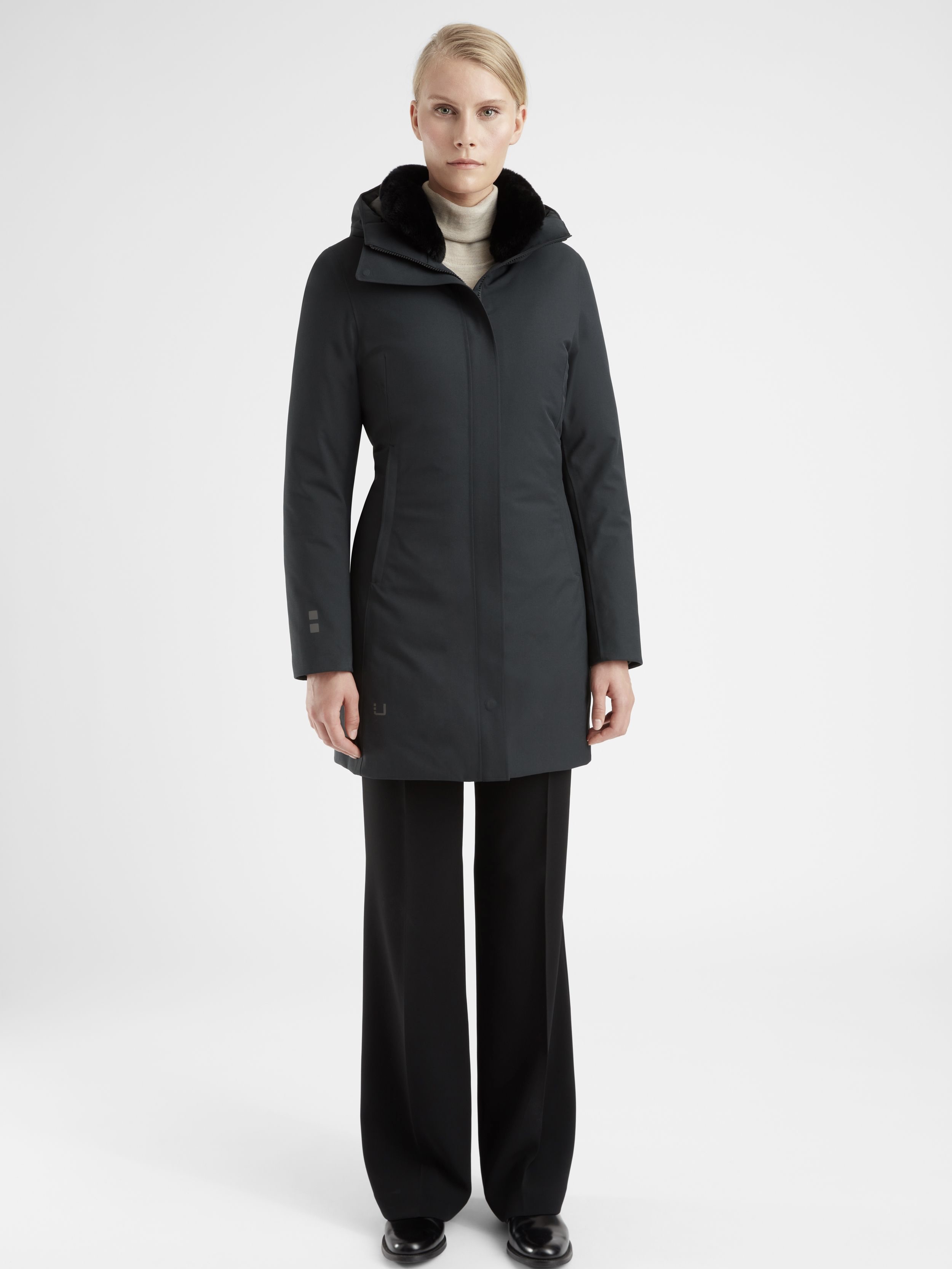 Svært nyskapende, veldig luksuriøs dunparkas. For generell urban bruk eller reiser. Vanlig passform. Lengde over kne. Den har en vannsøyle på 20 000.