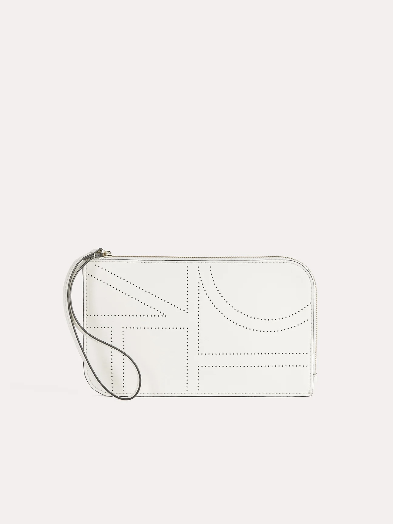 TOTEME-veske som fungerer som en hverdagsveske og kveldsveske. Den er laget i Spania av skinn perforert med det karakteristiske monogrammet og åpnes med en elegant gullfarget glidelås. La den dingle lekent fra armbåndsstroppen.