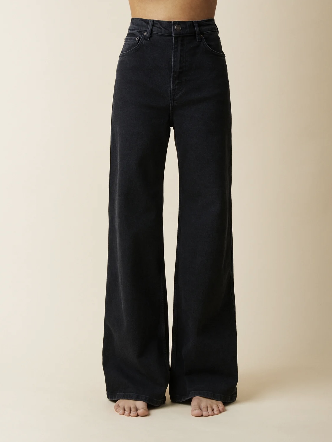 "Trevi" er en essensiell 5-lommers passform som strekker seg til forsterkede flare proporsjoner. Med glidelåsgylf, høy midje og sidesøm med trippelsøm langs bena. Laget i mildt falmet svart organisk denim, med et hint av stretch som skaper og beholder formen over tid.
