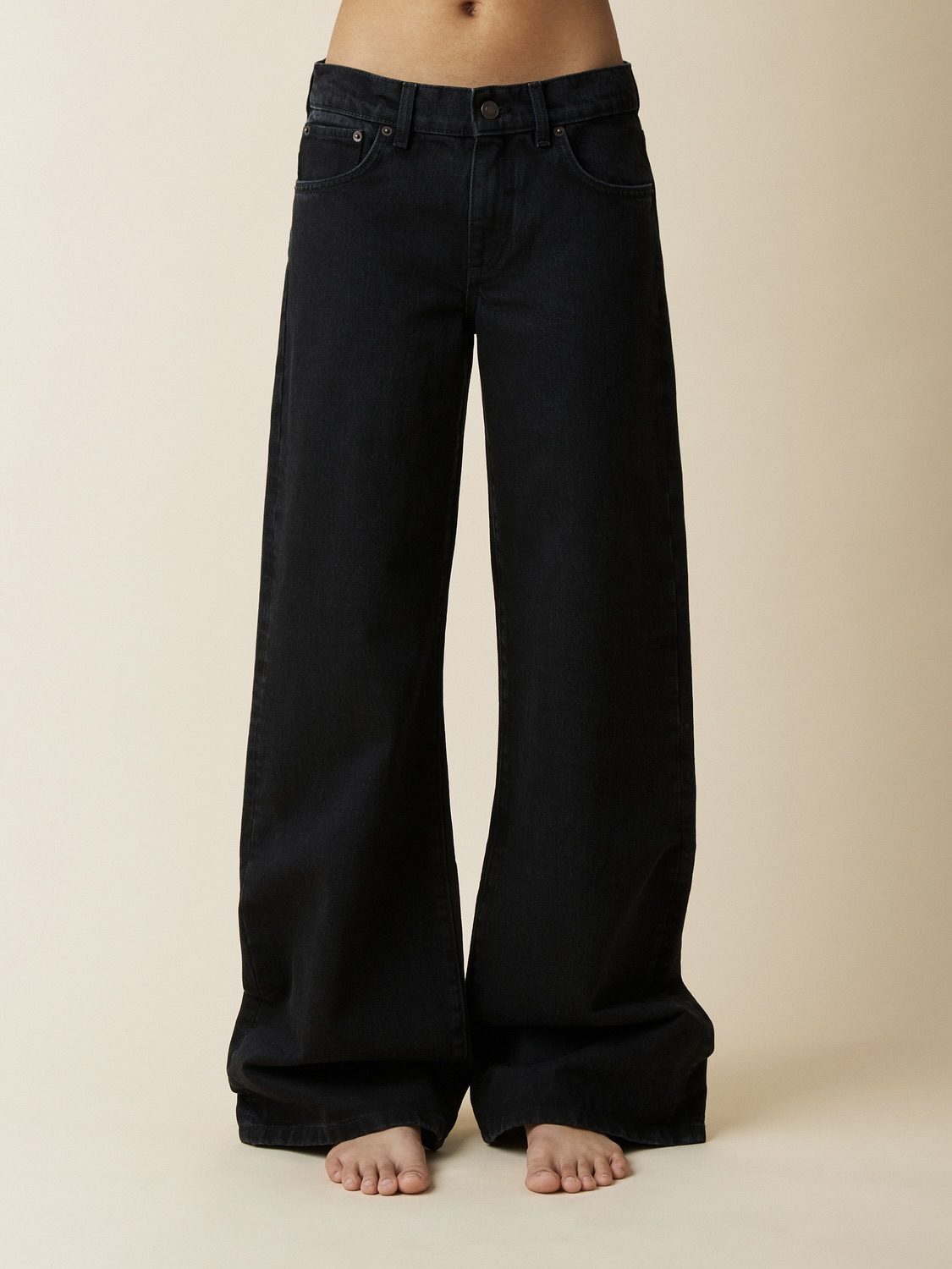 'Kyoto' er en uanstrengt kul, lav midje denim med en løs løs, utsvingt silhuett. Med glidelåsgylf, lav midje og et bredt ben fra låret som blir enda bredere i bunnen. Laget i mildt falmet svart organisk denim.