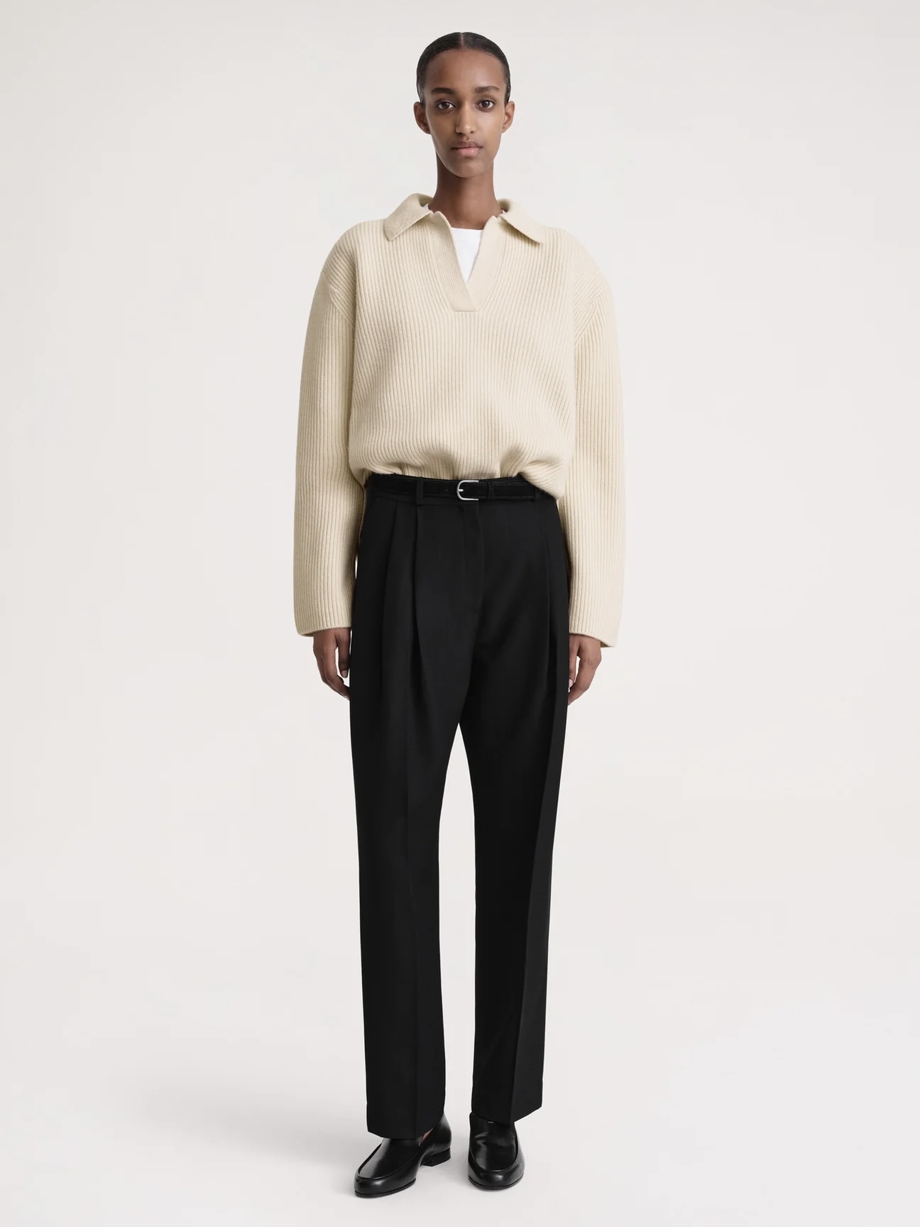 TOTEME-genser. Den har en avslappet, langlinjet silhuett ribbestrikket av sertifisert, tungvektsull med et snev av kashmir for varme og mykhet.