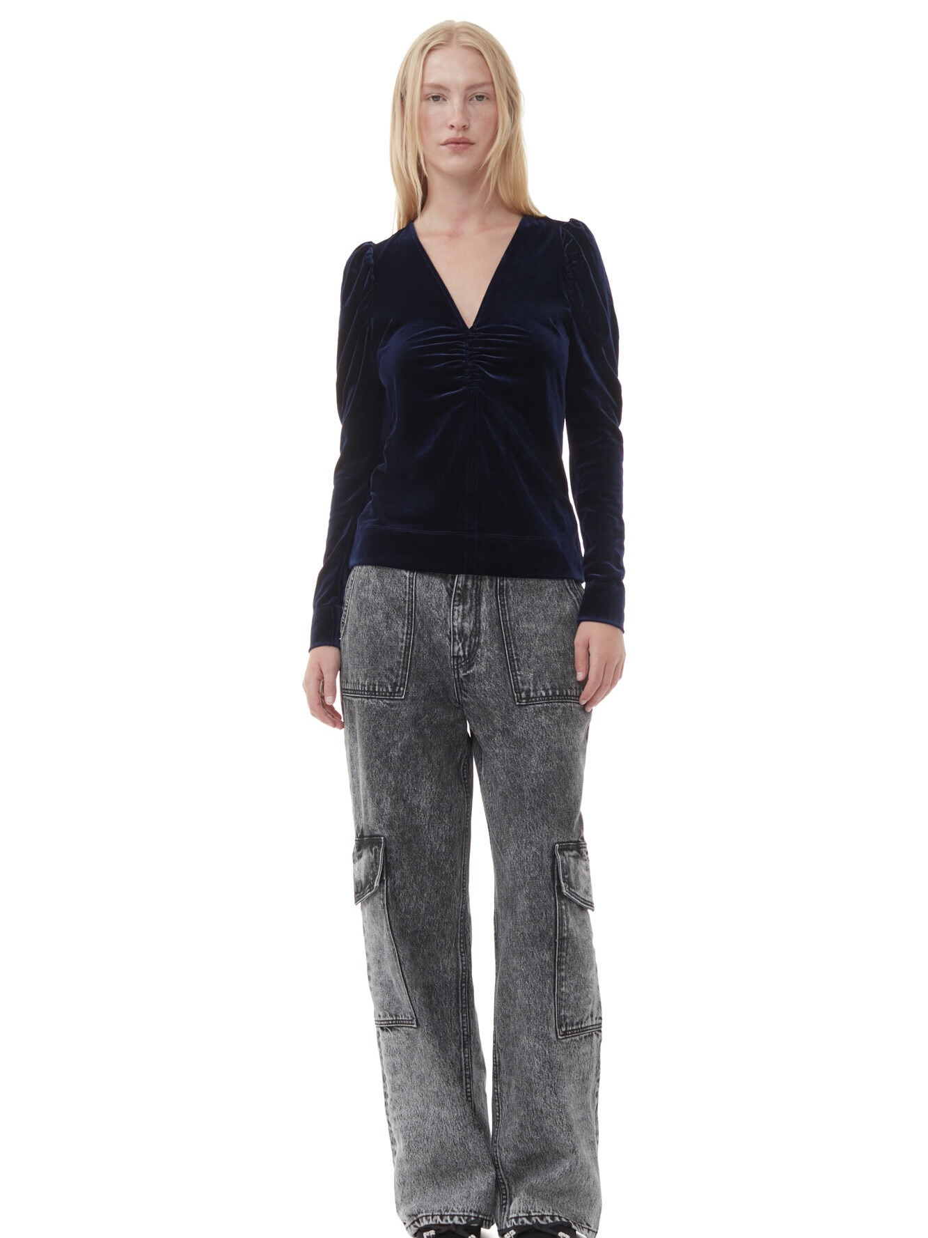 Blue Velvet Jersey V-neck Blouse er laget av en blanding av recycled polyester. Blusen er designet for en slimfit-passform og har V-hals, lange puffermer og lett rysjing foran.