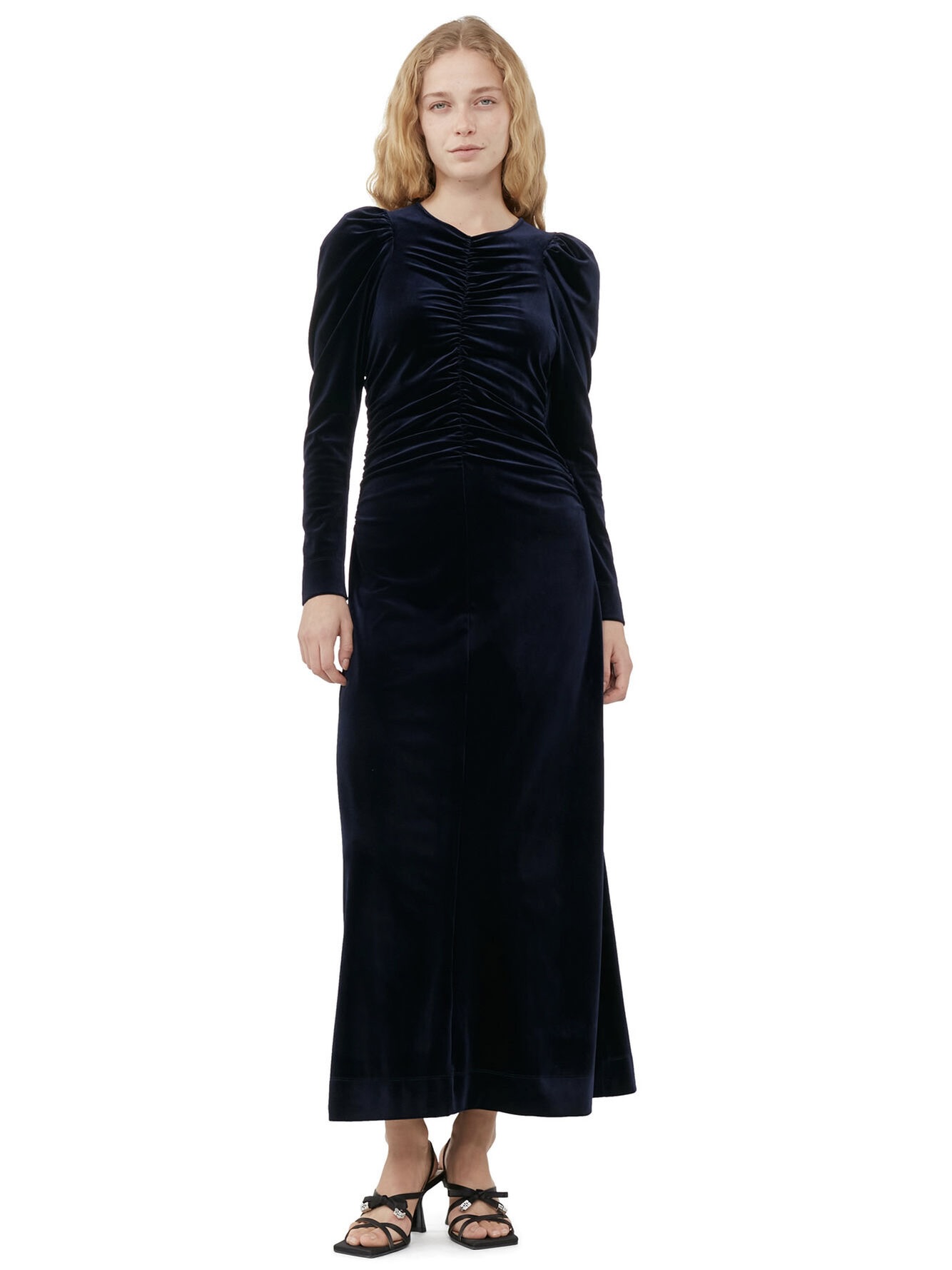 Denne blå kjolen i velur er laget av en blanding av resirkulert polyester. Kjolen er designet for en smal passform og har rund hals, lange puffermer, glidelåslukking og rynking foran, bak og på sidene.