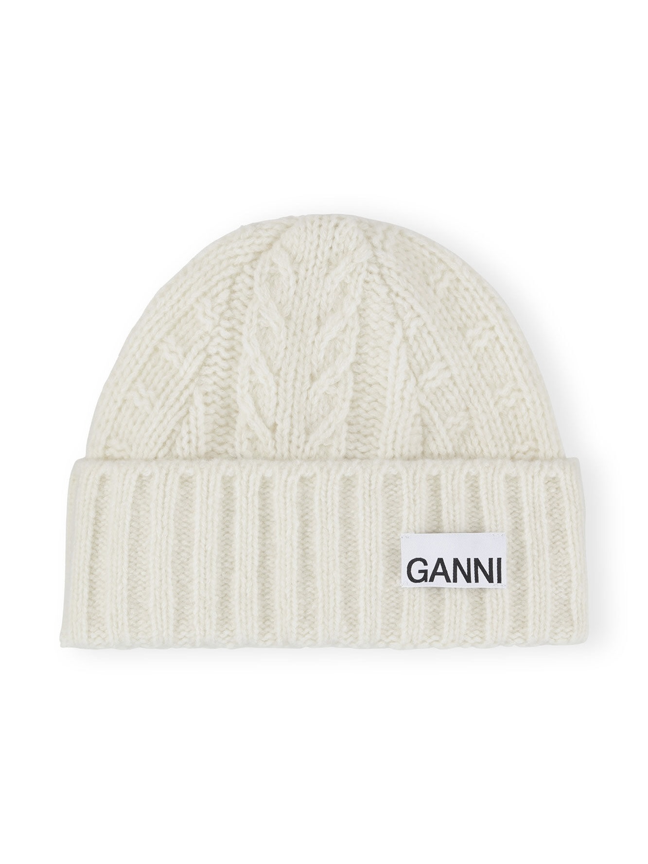 Denne hvite vanlige ull-kabelluen er laget av en blanding av resirkulert ull og har en GANNI-logo og kabelstrikket design.