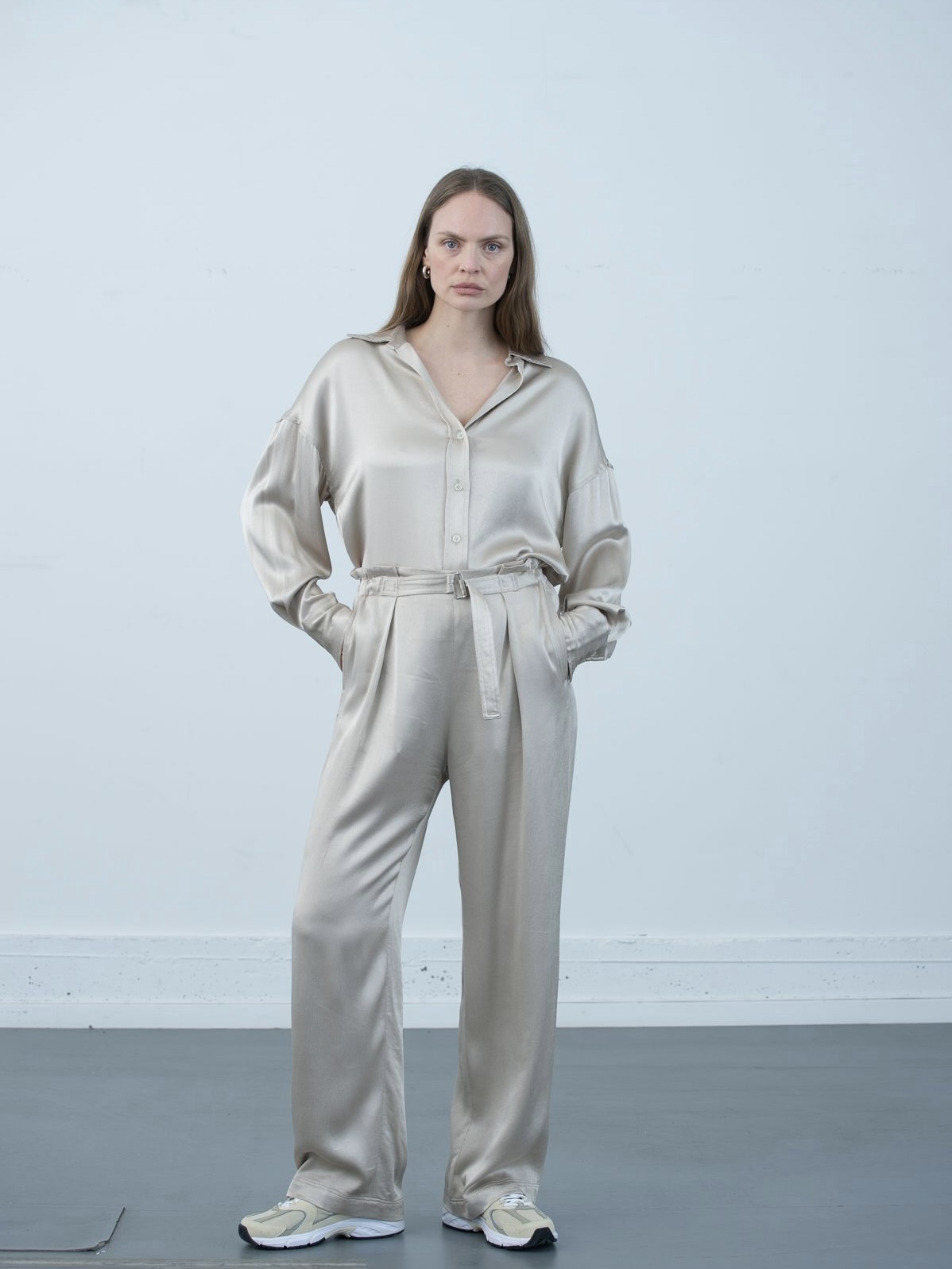 Bukse i en nydelig sateng finish med høyt liv i en løs og ledig silhuett. Modellen er designet med iøynefallende folder ved linningen, strikk i livet, beltespenne-løsning og passepoil lomme bak. Rett fasong med et flytende fall.