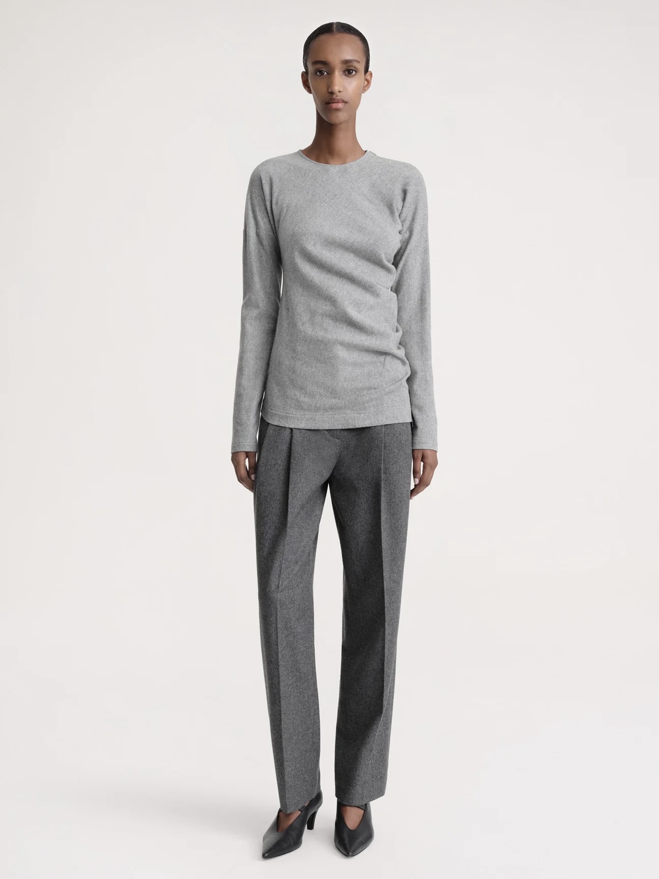 TOTEME-topp konstruert med en asymmetrisk silhuett som omslutter kroppen ved å vri seg lekent i midjen. Den er laget av en mykt børstet ullblanding med et hint av elastan og har en skjult glidelås på den ene skulderen for å få den på.