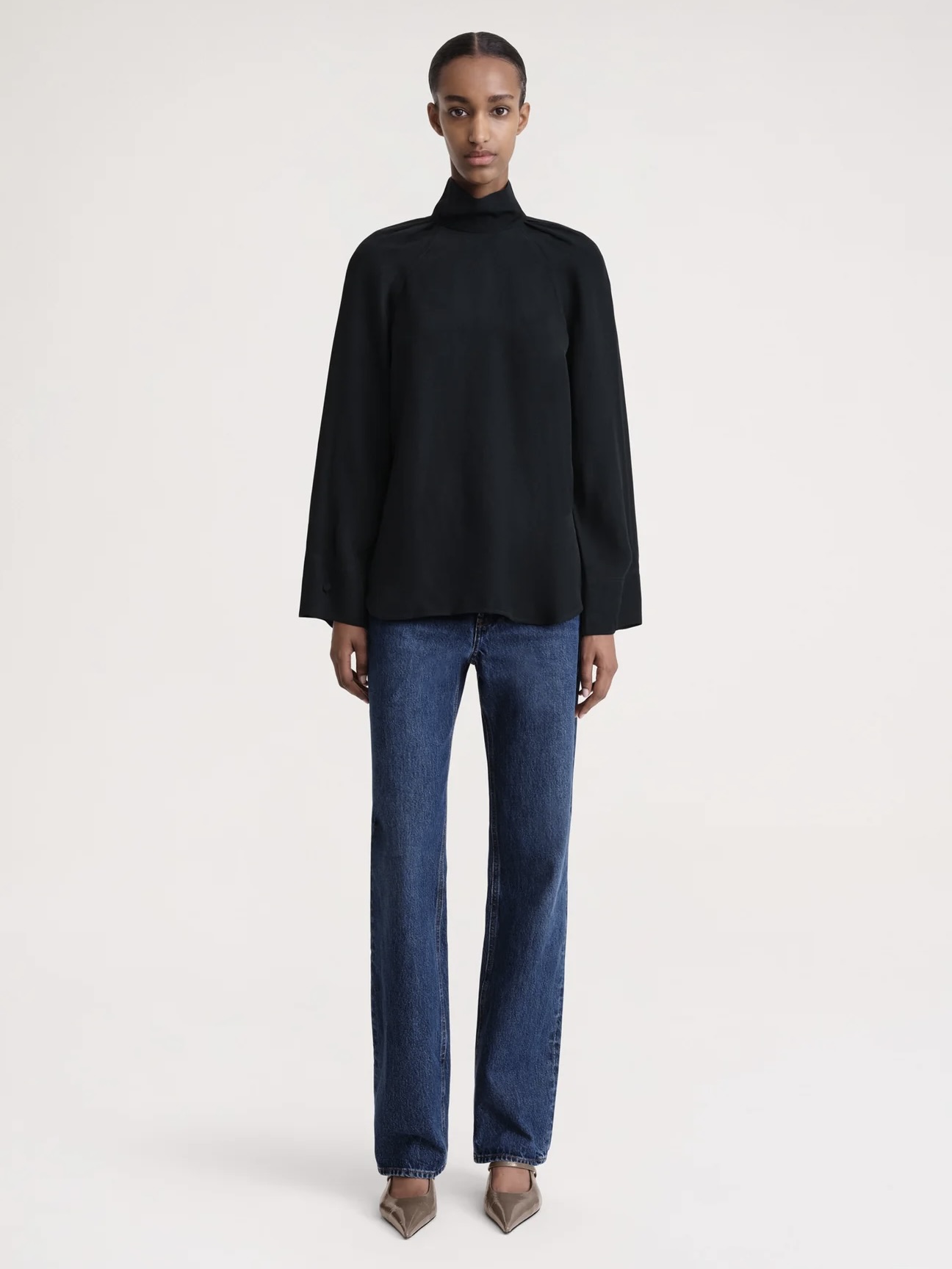 TOTEME kveldsbluse som legemliggjør kolleksjonens myke side med urokkelig selvtillit. Den er laget av flytende crepe med sateng-rygg med høy hals og rynkede raglan-ermer som blusser mot mansjettene.