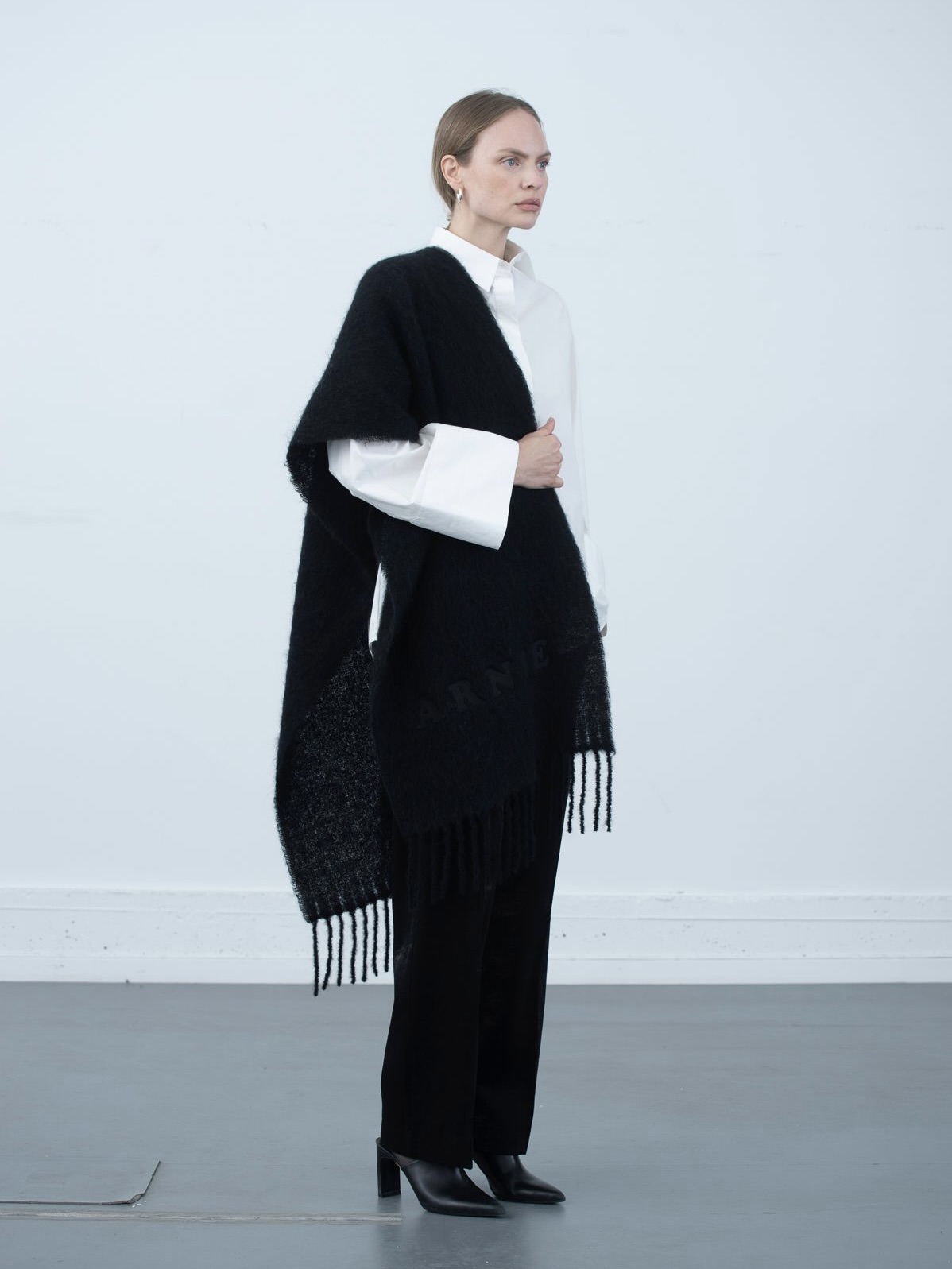 Stort skjerf laget av en myk, langhårete ullblanding. Detaljert med frynser og et brodert logodesign.