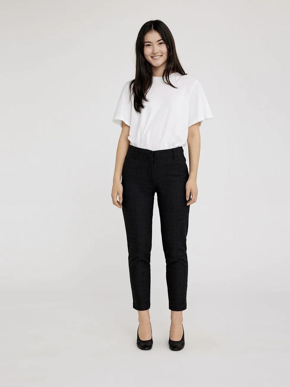 'Julia' er klassiske bukser med konisk passform du kan ha på deg hele dagen, komfortabelt – på din egen måte. Disse er laget av fyldig svartrutet twillvevd stoff i rutete design med 62% resirkulert polyester. Ettersom de er midt i midjen og har en krøllet søm, konstruerte vi dem for å hvile på hoftebeinet, fremheve hoftene og lårene og elegant definere bena. De kommer også med en oppbygget linning som er perfekt med et belte. Og "sigarettkuttet"-silhuetten er preget av en rett og rørlignende bane som ender ved anklene og skummes over bena, noe som understreker Julias elegante natur.