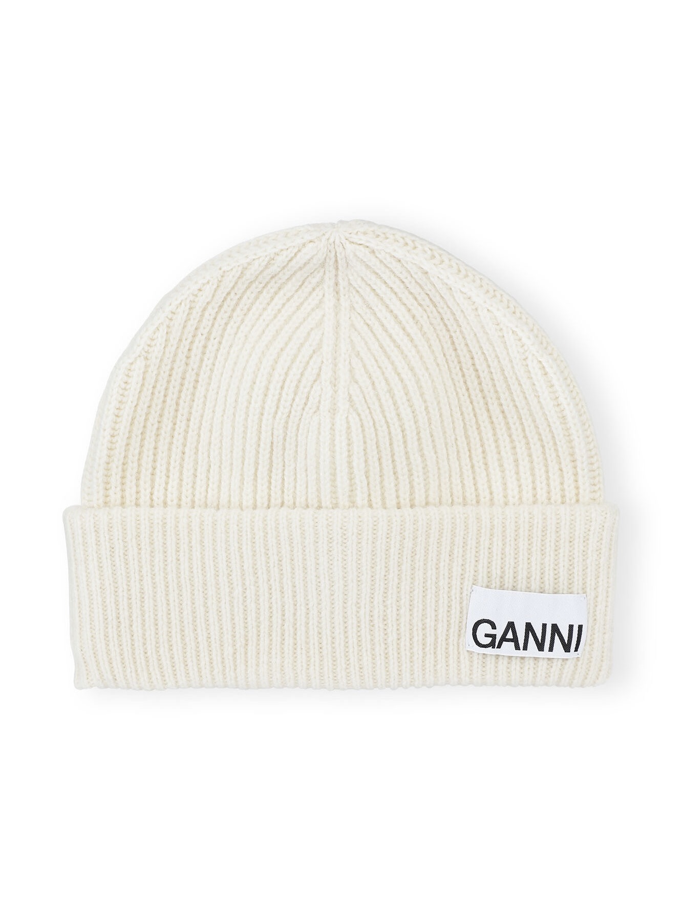 Denne hvite strukturerte ribbeberetten er laget av en blanding av resirkulert ull, ull og resirkulert polyamid. Luen har ribbet kant og GANNI-logo.