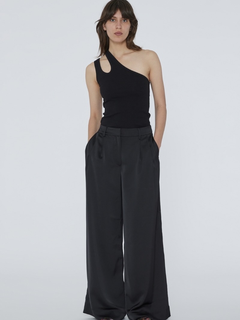 Disse svarte buksene, laget av 100 % resirkulert polyester, viser frem tydelige folder som gir dybde og bevegelse. Med en bred silhuett gir de en harmonisk blanding av komfort og stil.