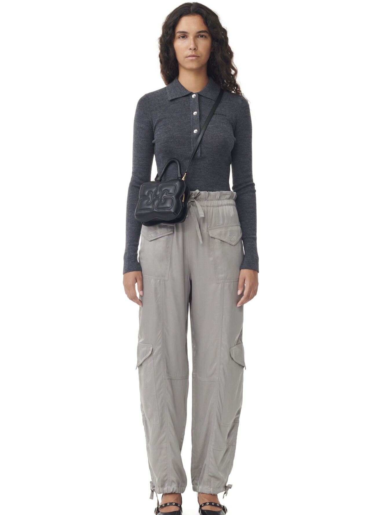 Grey Washed Satin-buksene er laget av en blanding av LENZING™ ECOVERO™ viscose og cupro. Buksene er designet for en avslappet passform og har snørelukking i midjen og anklene, og lommer foran, bak og på sidene.