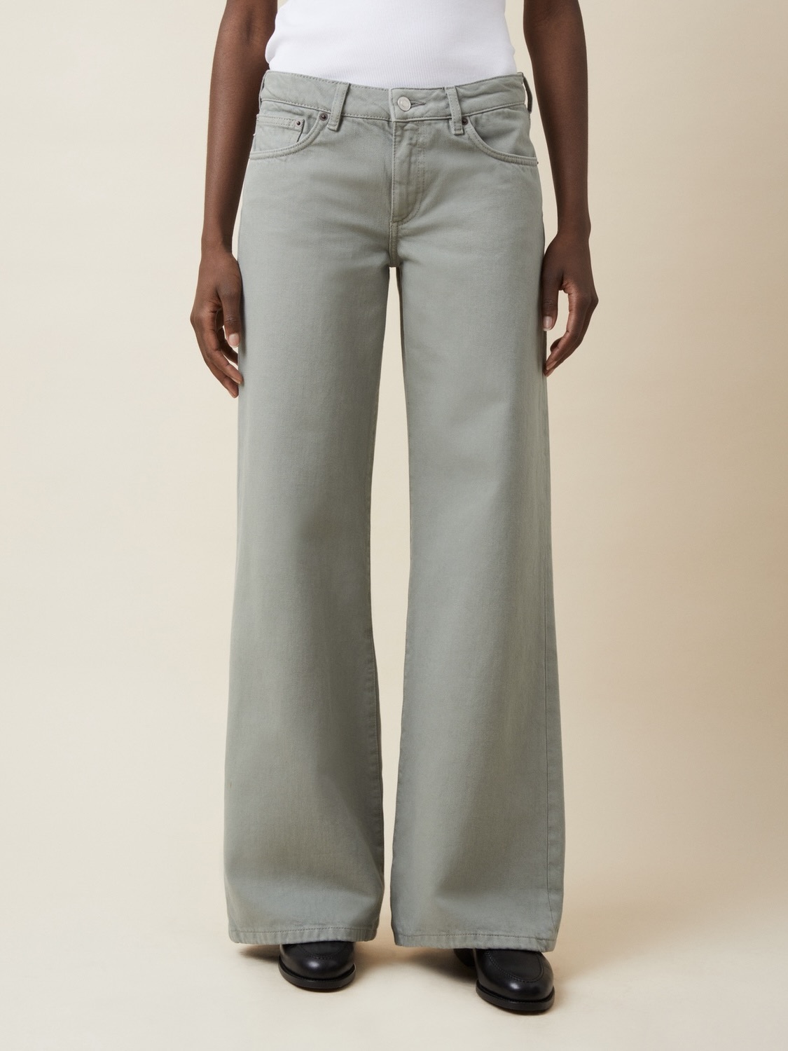 'Kyoto' er en uanstrengt kul, lav midje denim med en løs løs, utsvingt silhuett. Med glidelåsgylf, lav midje og et bredt ben fra låret som blir enda bredere i bunnen. Laget av 75 % resirkulert bomull og 25 % viskose, som gir en myk touch samtidig som den beholder en klassisk denimfølelse.