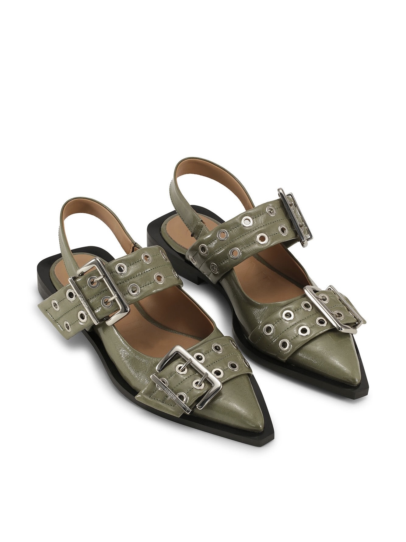 Disse grønne Chunky Buckle Ballerinaene er laget av 51 % resirkulert polyester. De har en flat firkantet hæl, slingback-stropper, store metallspenner med hulldetaljer og en gravert GANNI-logo.