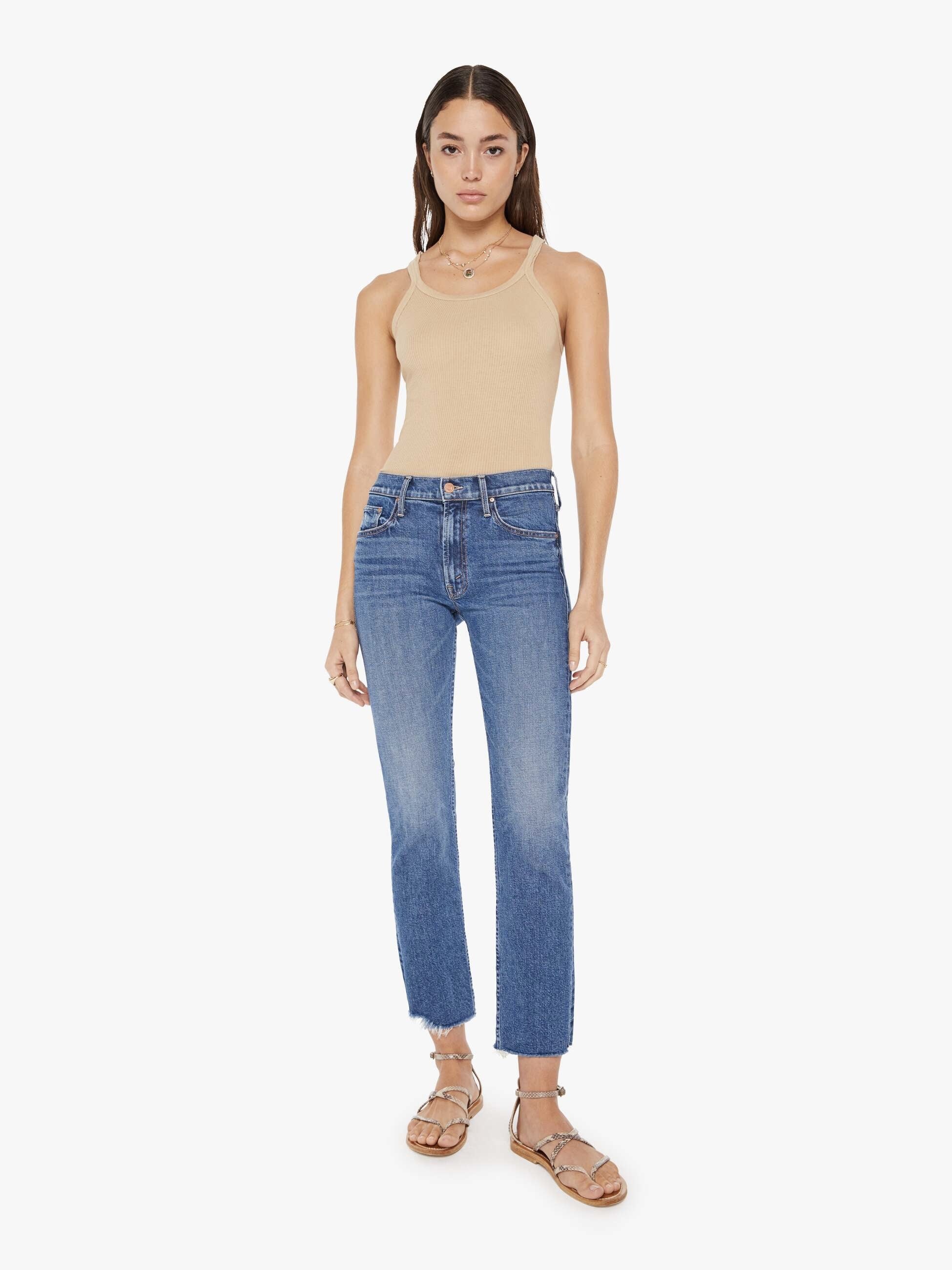 Mellomhøyde rett ben med ankellengde innersøm og frynsete kant. Local Charm er skåret av denim med et snev av stretch og er en mellomblå vask med værhår og falming på knærne.