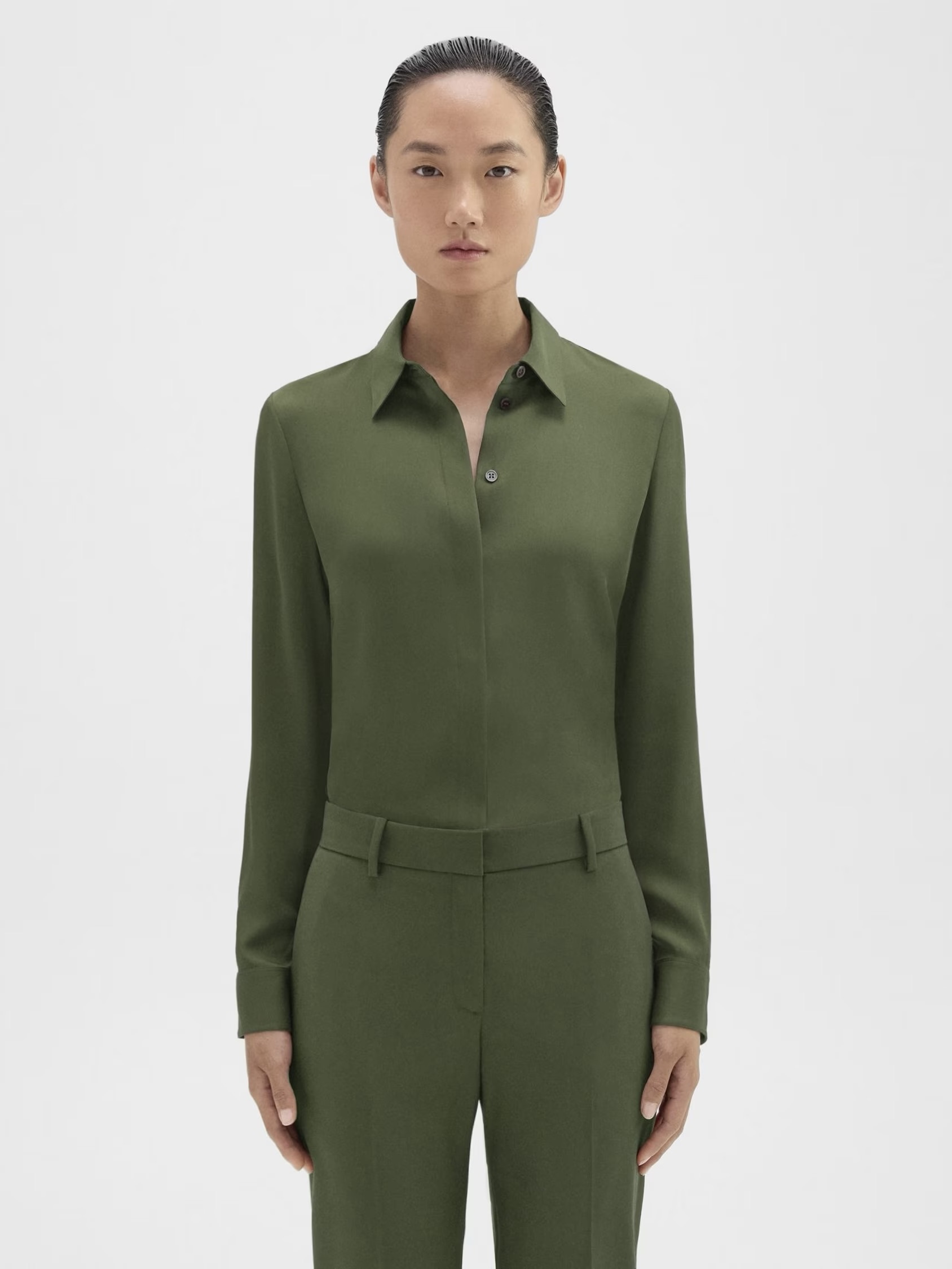 Theory sin klassiske figursydde skjorte er skreddersydd i en polert, feminin form som kan brukes alene eller under en blazer. Den er detaljert med en skjult knappestolpe, justerbare mansjetter, perlemorknapper og en avrundet kant. Laget med vår lette, pustende silke georgette med en elegant drapering som er enkel å style hele året.