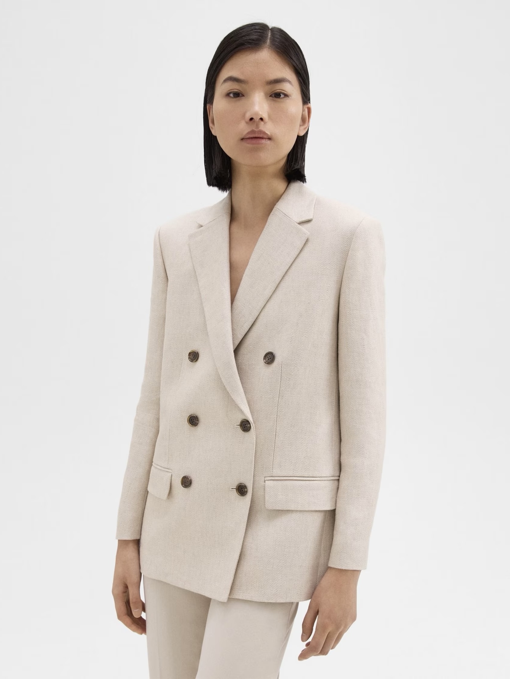 Denne blazeren er forankret i tradisjonell skreddersøm, og er kuttet for en overdimensjonert, boksy silhuett med et hakk i jakkeslaget og en dobbeltspent front. Med en subtil glans, er denne versjonen kuttet av en spesialutviklet vevd lin tweed i en naturlig linfarge som fremhever den naturlige fargen og egenskapene til fiberen.