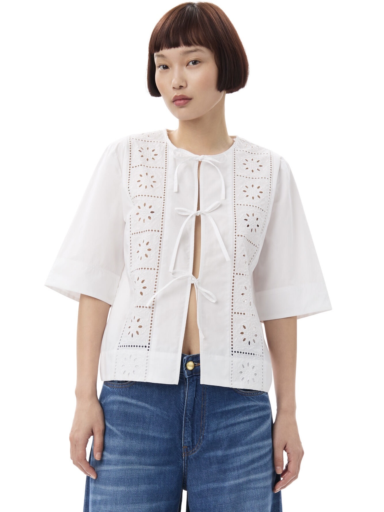 Denne hvite Broderie Anglaise slipsblusen har en rund hals, tre knytebånd foran og albuelange ermer.
