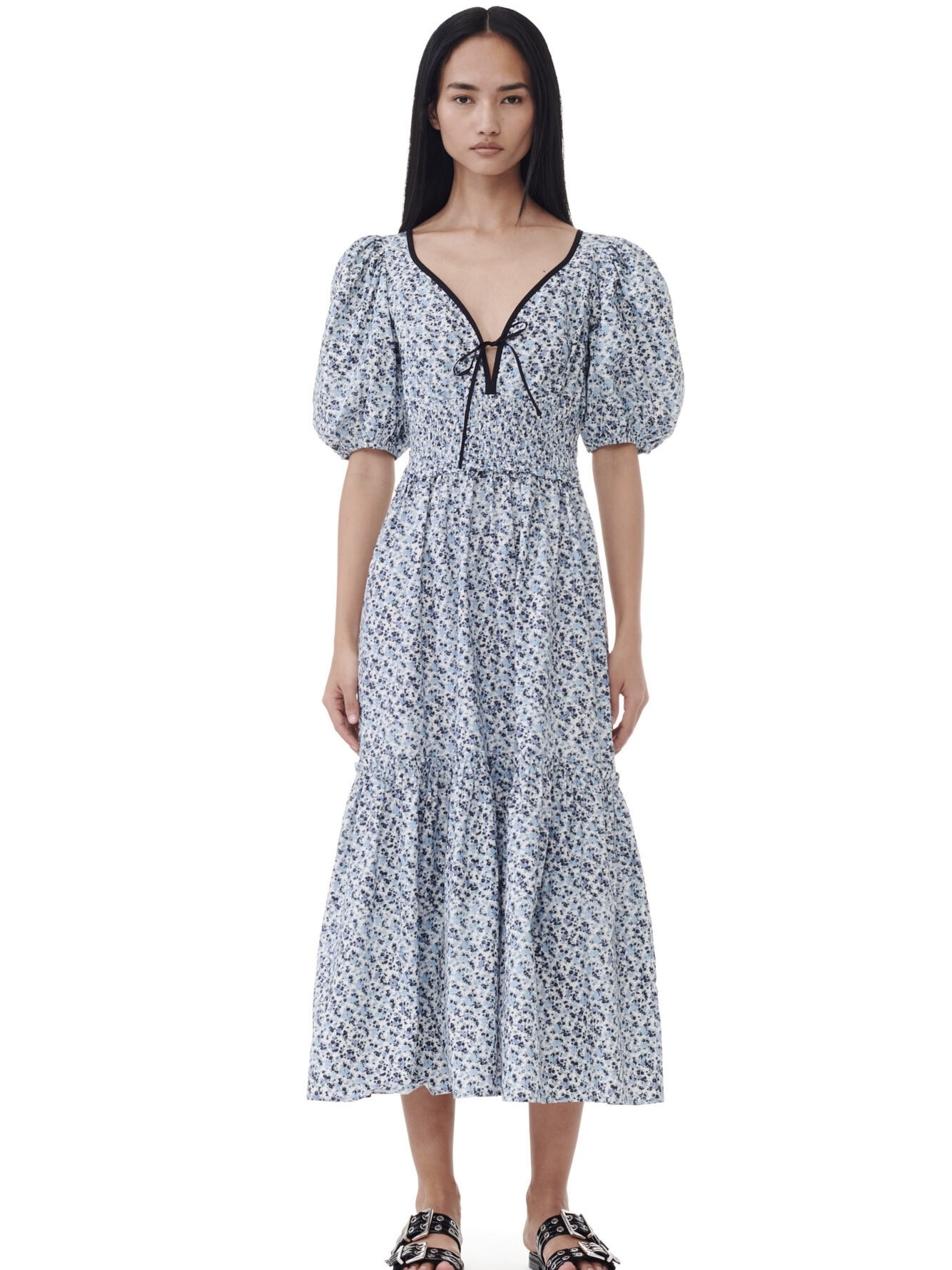 Lange smock-kjole fra Ganni i bomull med blå blomstertrykt har en dyp hals, puffermer med elastiske kanter og en kittel.