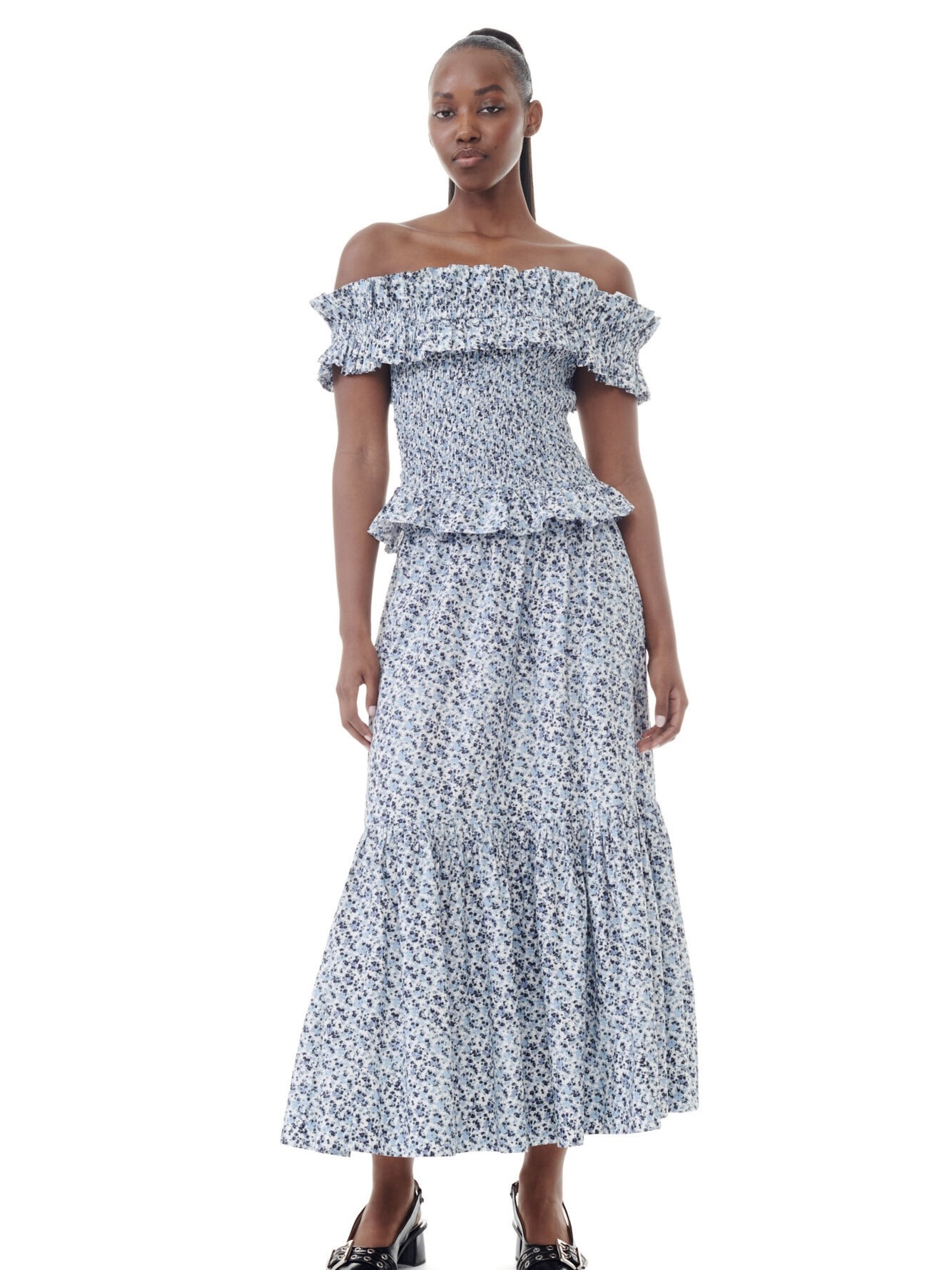 Blå floral trykt bomull Maxi volangskjørt fra Ganni. Med en elastisk midje og et blått blomstertrykk.