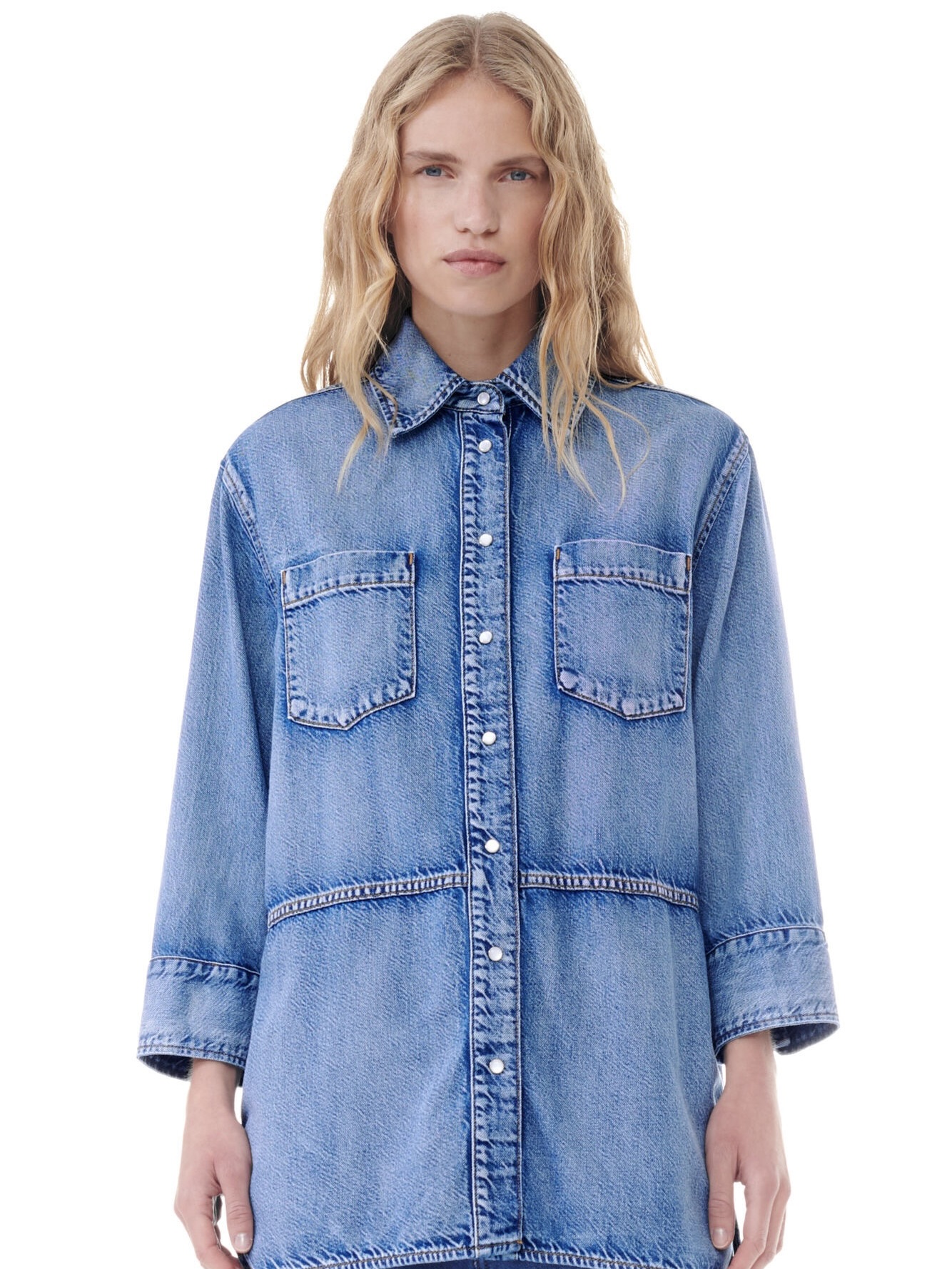 Blå denim oversized skjorte fra Ganni. Med krage, knappelukking foran og frontlommer.