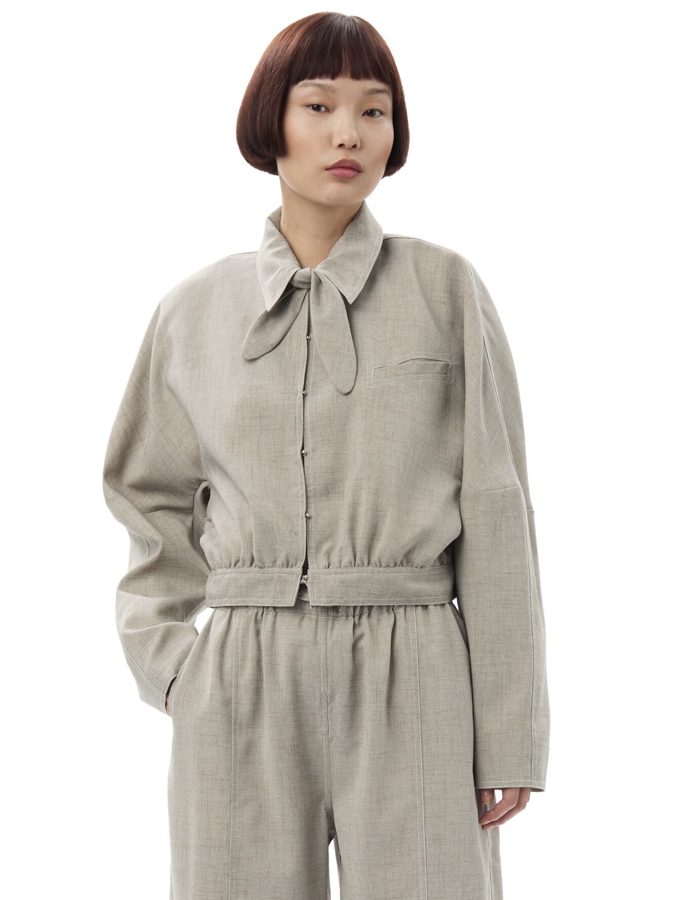 Kort, gråmelerte jakke fra Ganni. Med en krage med sløyfedetalj, kroklukking foran og dekorativ lomme.