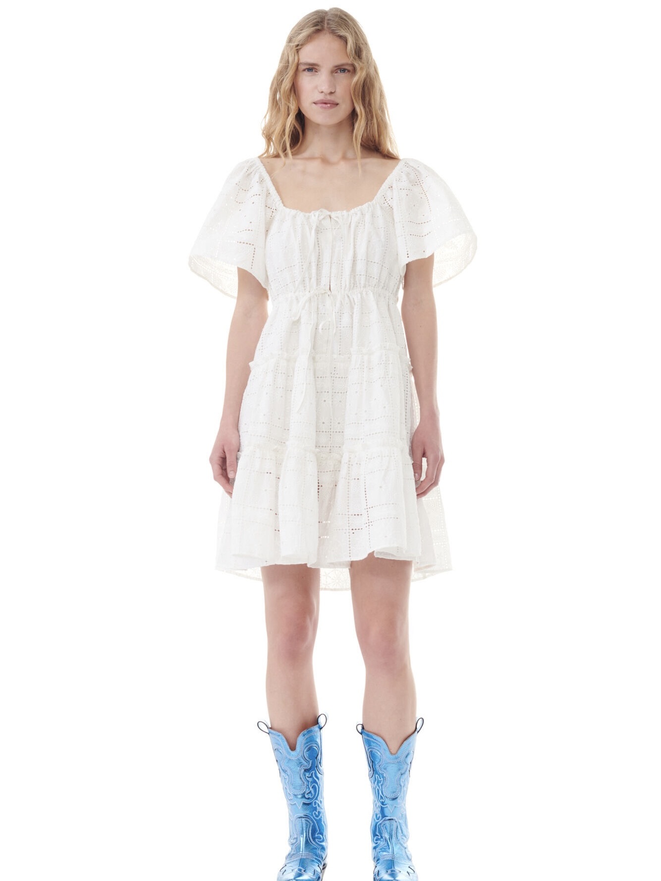 Hvite Broderie Anglaise Layer-kjole fra Ganni. Med korte ermer og en firkantet hals med knytebånd.