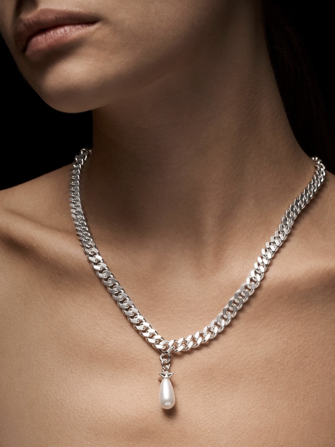 Legg til et snev av raffinement og edge til utseendet ditt med Chunky Chain Drop Pearl Necklace fra Maria Nildotters Moondust-kolleksjon. Dens vakre kontrast mellom myke og harde elementer skaper et stemningsfullt og uforglemmelig smykke.